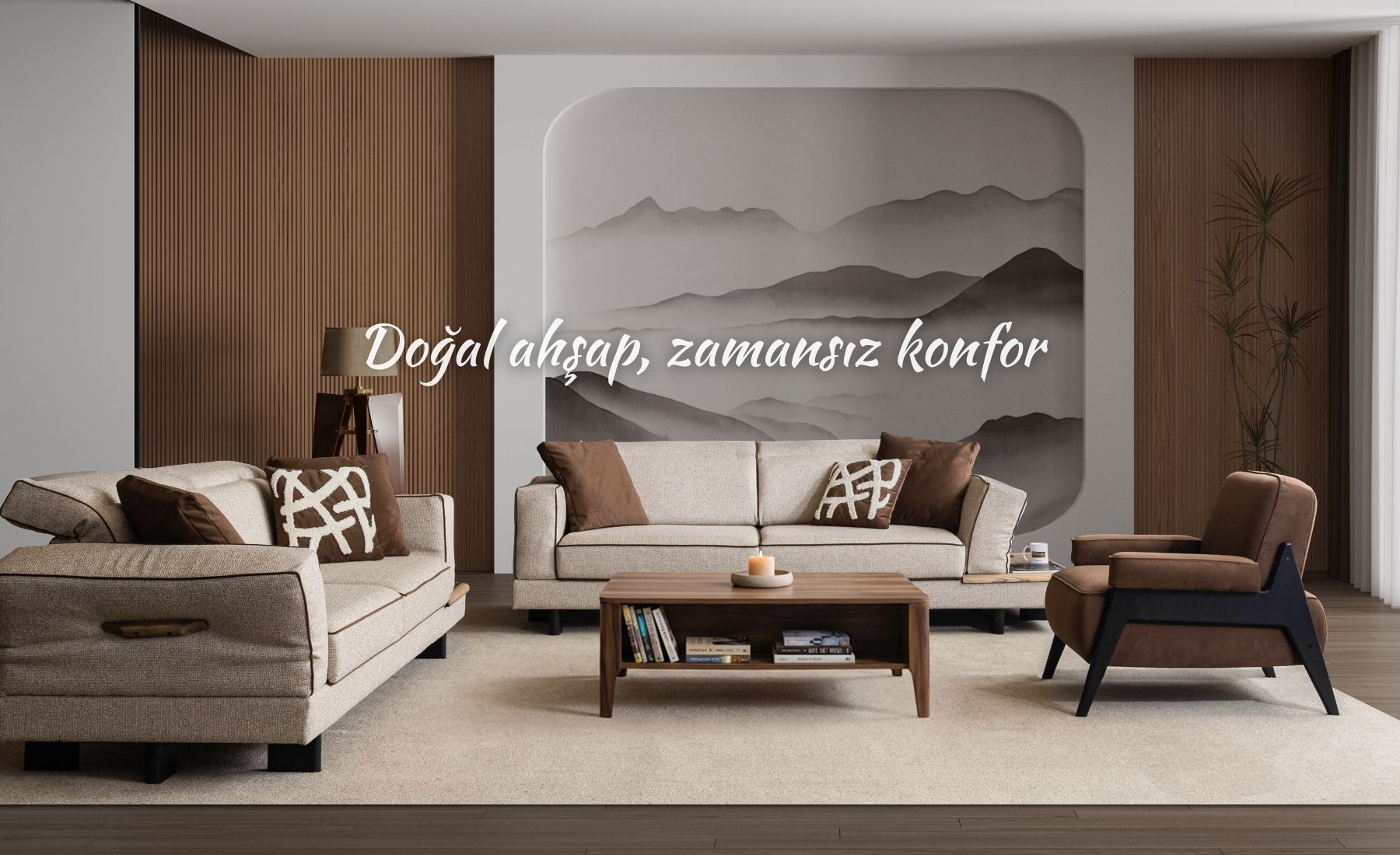 Ürünlerde kullanılan doğal ahşap detaylar, mekâna sıcak ve dengeli bir karakter kazandırır. Doğallığı hissedilen, zamansız bir görünüm sunar.